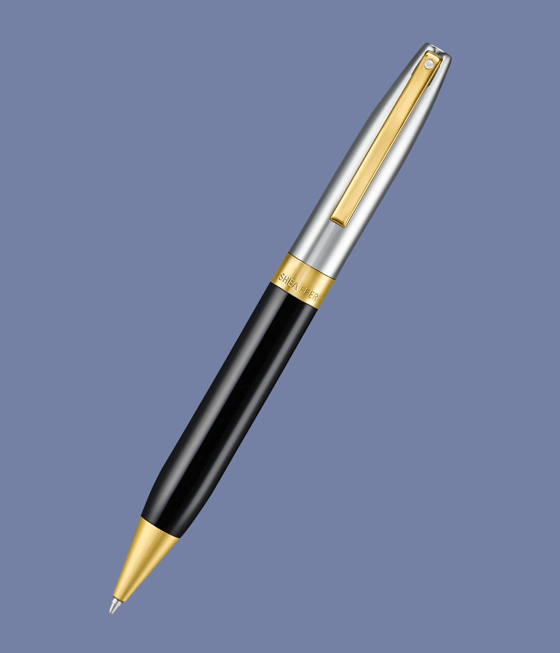 Długopis wykonany został z metalu, co zapewnia solidność i odpowiednie wyważenie podczas pisania. Czarny lakier nadaje głębi koloru i eleganckiego charakteru, natomiast chromowana część górna w połączeniu ze złoconymi elementami PVD tworzy efektowną i prestiżową całość. Charakterystyczna biała kropka na klipsie – symbol marki Sheaffer – stanowi subtelny akcent potwierdzający autentyczność modelu.