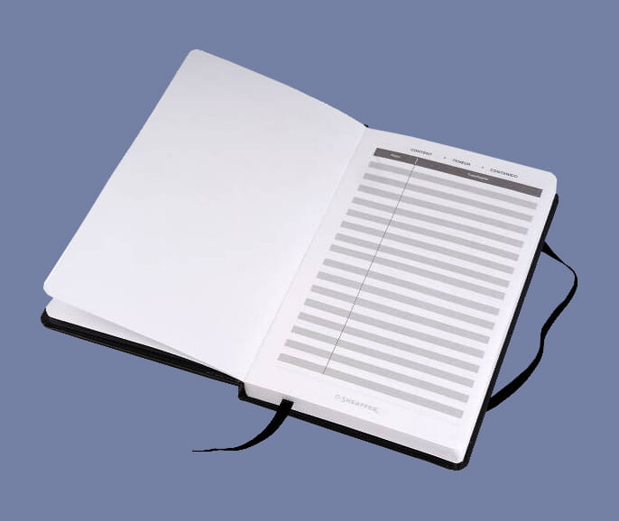Papier posiada certyfikat FSC, jest bezkwasowy, przyjazny dla atramentu oraz minimalnie przebija, co sprawia, że idealnie nadaje się zarówno do długopisów, jak i piór. Notes został dodatkowo wyposażony w praktyczną kieszeń z tyłu, która pomieści drobne dokumenty czy luźne kartki, a także kolorystycznie dopasowaną gumkę oraz elegancką satynową zakładkę.